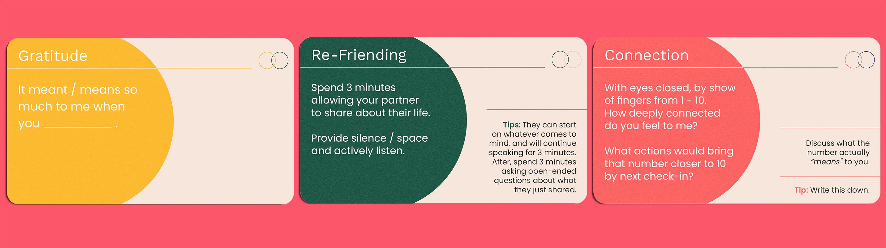 Re-ignite or kickstart your connection through deeper conversations + understanding each other's needs.