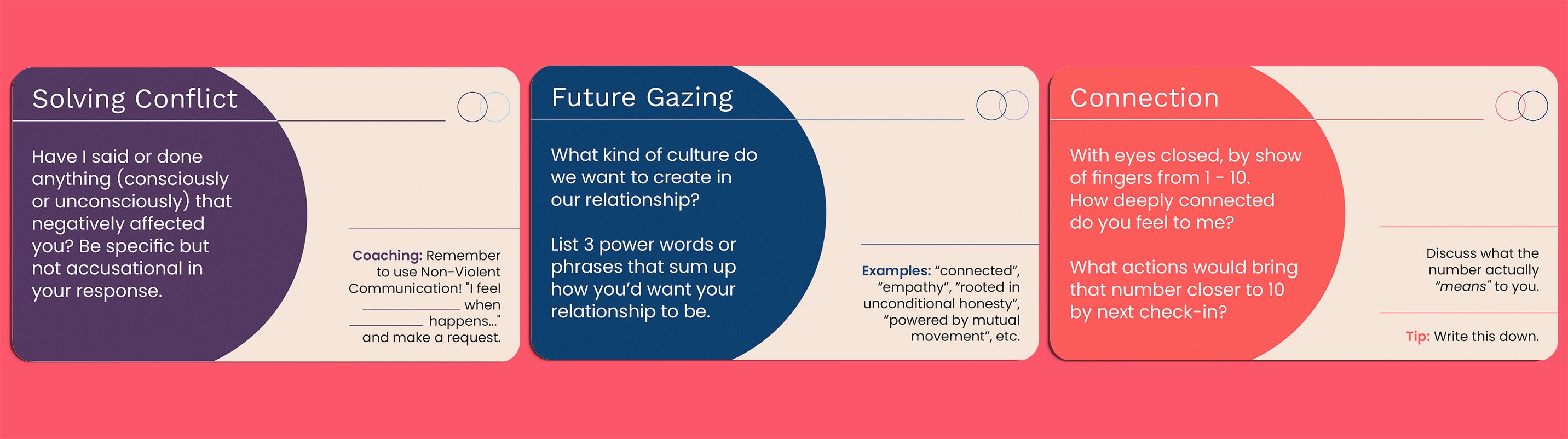 Almost 10 years, and a baby, later, our Check-Ins have become a go-to touchpoint for reconnecting and sharpening up on the "basics" of healthy relating, conflict resolution, and communication.